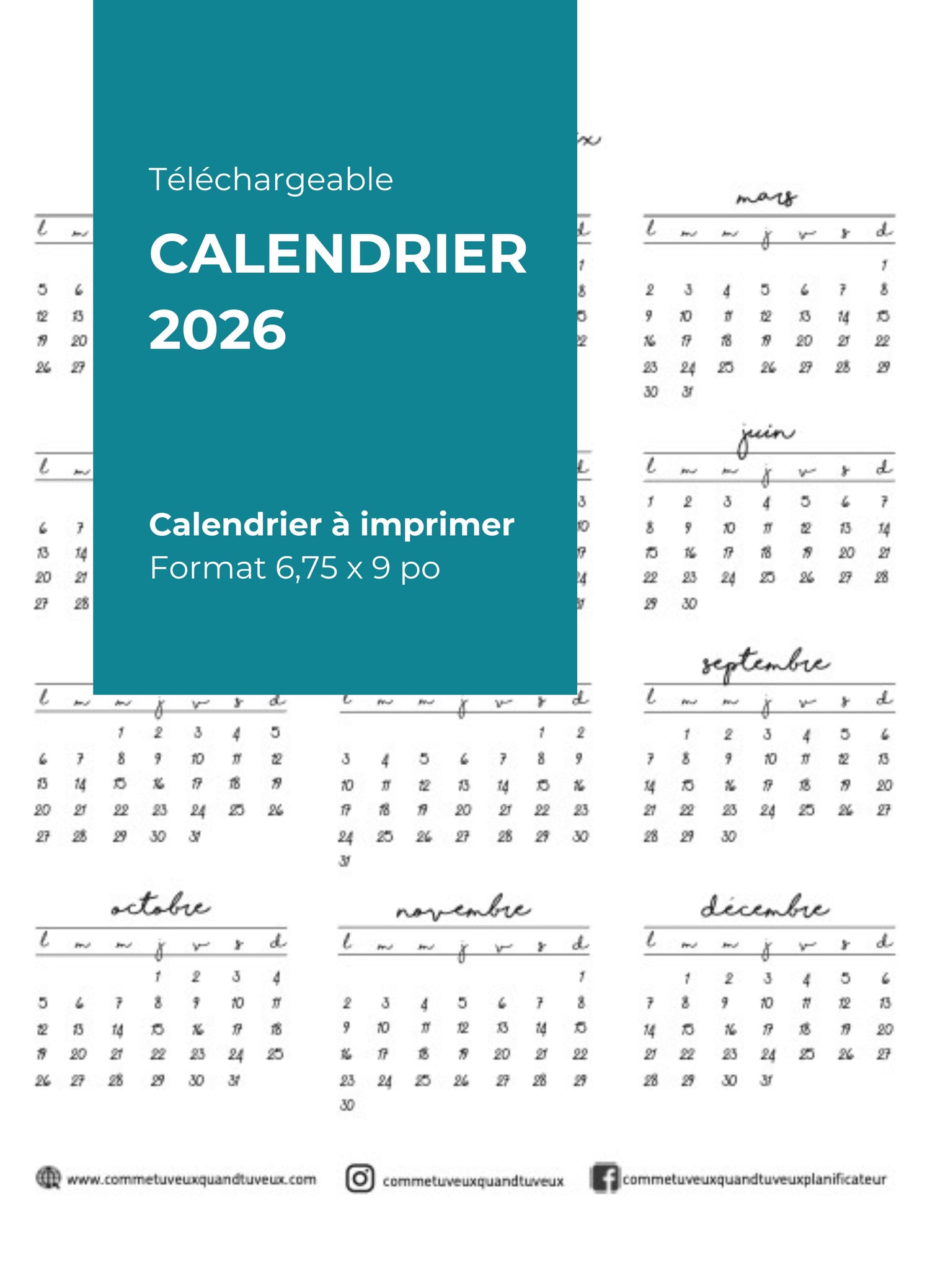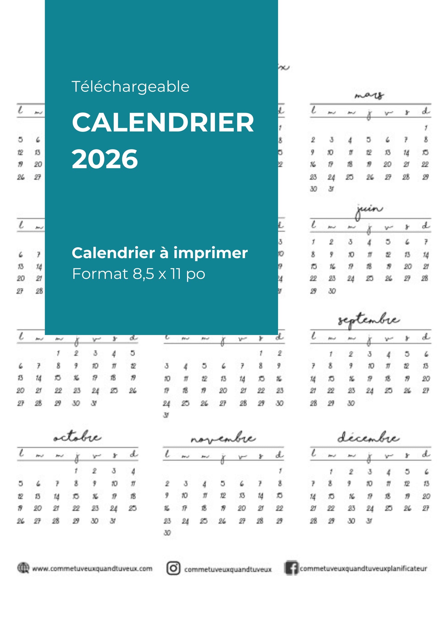 Pour bien t'organiser, voici notre Calendrier Imprimable au format 8.5x11.